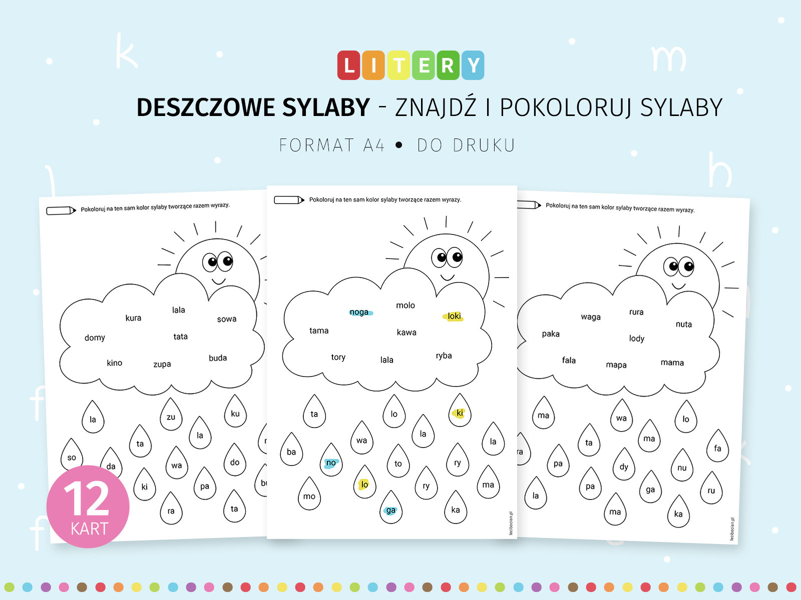 Deszczowe sylaby to zestaw kart pracy, w których zadaniem dziecka jest znalezienie dwóch sylab tworzących wyraz i pokolorowanie ich. Każda karta zawiera 8 rożnych wyrazów (rzeczowników) do wyszukania i 16 sylab do pokolorowania. To świetny pomysł na naukę sylab, sylabowania i naukę czytania dla dzieci. W zestawie znajdziesz 12 kart z sylabami do wyszukiwania i 96 różnych wyrazów!