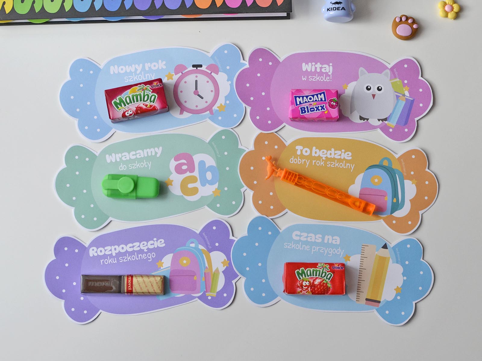 Zakładki na słodycze i cukierki na rozpoczęcie roku szkolnego. Stwórz drobiazg dla ucznia na rozpoczęcie roku szkolnego. W zestawie znajdziesz 6 różnych wzorów zakładek na słodycze. Można je uzupełnić cukierkiem, gumami, lizakami, Kinder Czekoladkami lub różnymi małymi upominkami.